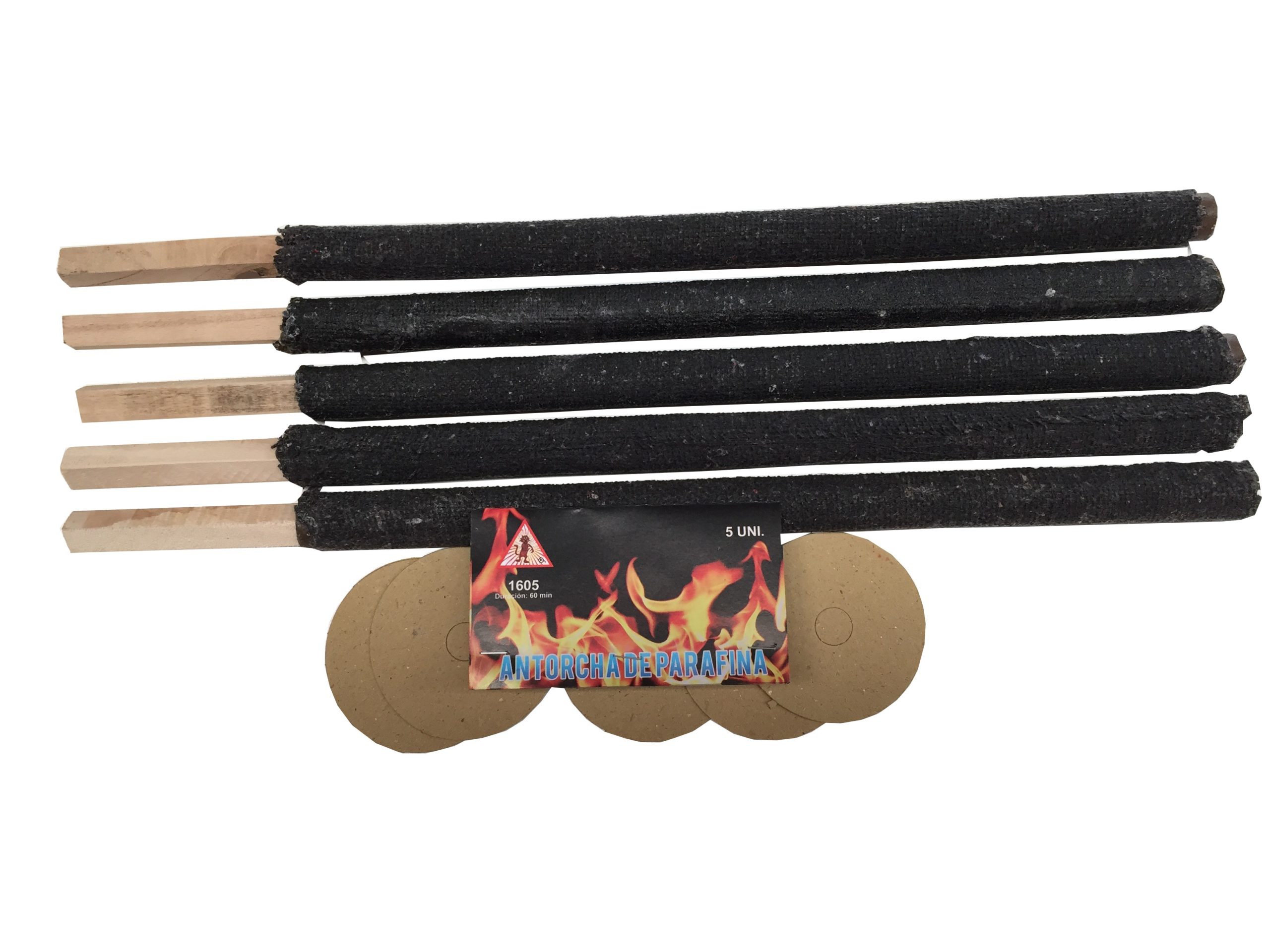 5 Antorchas de Parafina de 1,5 hora de duración y que producen una gran llama de fuego.