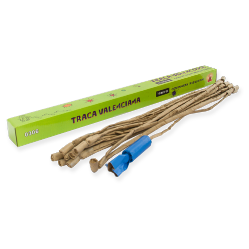 Traca valenciana de 10 metros con trueno final que producen detonaciones en cadena y un gran trueno final. CLASE III.